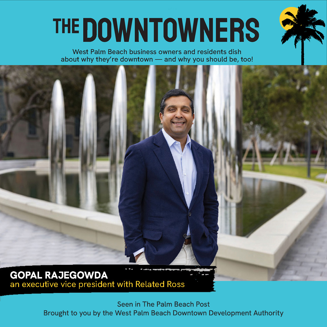 Meet real estate developer Gopal Rajegowda, an executive vice president with Related Ross. He has long been passionate about developing successful destinations that combine world-class design, urban planning, hospitality, arts and culture, experiential retail, food and beverage, and community. With his global experience, he’s uniquely qualified to manage his current projects: the reimagination of CityPlace neighborhood in Downtown West Palm Beach, as well as also leading the development of 360 Rosemary (a Class-A office building); 575 Rosemary (a mixed-use tower that includes luxury residences and retail space); and One Flagler (a Class-A world-class office building located along the Downtown West Palm Beach waterfront). Passionate about his community, Rajegowda serves as a board member of the Economic Council of Palm Beach County, Chamber of Commerce of The Palm Beaches and Cultural Council of Palm Beach County, and was recently named to the West Palm Beach Mayor’s Taskforce for Racial and Ethnic Equality. He officially began working in Downtown West Palm Beach in 2016.