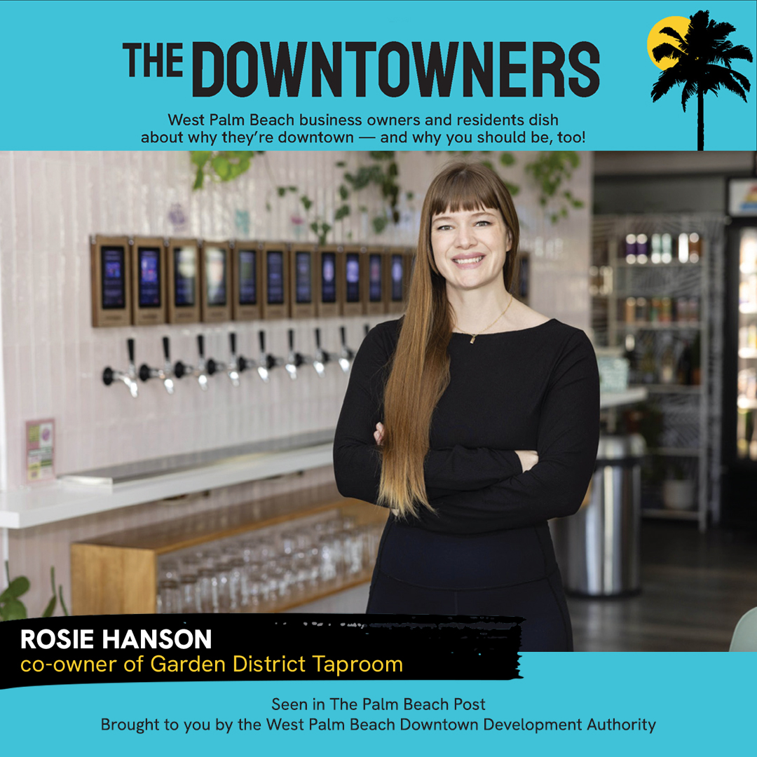 Meet Rosie Hanson, the co-owner of Garden District Taproom in Downtown West Palm Beach. A lifelong Floridian, she grew up and attended college in Gainesville. She taught in public schools for eight years before resigning in 2021 and, along with her husband Josh (with whom she is raising their young son), opened Garden District Taproom.
